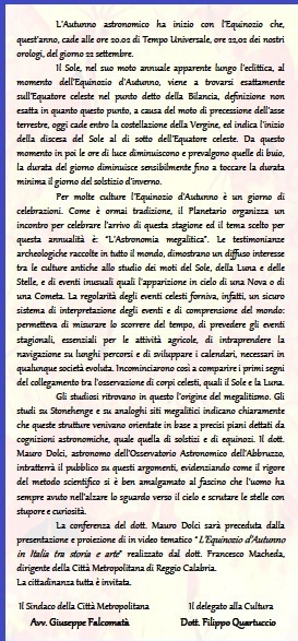 La regolarità degli eventi celesti forniva, infatti un sicuro sistema di interpretazione degli eventi e di comprensione del mondo: permetteva di misurare lo scorrere del tempo, di prevedere gli eventi stagionali, essenziali per le attività agricole di intraprendere la navigazione su lunghi percorsi e di sviluppare i calendari, necessari in qualunque società evoluta. Incominciarono così a comparire i primi segni del collegamento tra l’osservazione di corpi celesti, quali il Sole e la Luna. Gli studiosi ritrovano in questo l’origine del megalitismo. Gli studi su Stonehenge e su analoghi siti megalitici indicano chiaramente che queste strutture venivano orientate in base a precisi piani dettati da cognizioni astronomiche quale quella di solstizi e di equinozi. Il dott. Mauro Dolci, astronomo dell‘Osservatorio Astronomico dell’Abruzzo, intratterrà il pubblico su questi argomenti, evidenziando come il rigore del metodo scientifico si è ben amalgamalo al fascino che l’uomo ha sempre avuto nell’alzare lo sguardo verso il cielo e scrutare le stelle con stupore e curiosità. La conferenza del dott. Mauro Dolci sarà preceduta dalla presentazione e proiezione di in video tematico “L’Equinozio d’Autunno in Italia tra storia e arte” realizzato dal dott. Francesco Macheda, dirigente della Città Metropolitana di Reggio Calabria. La cittadinanza tutta è invitata. Il Sindaco della Città Metropolitana Avv. Giuseppe Falcomatà Il delegato alla Cultura Dott. Filippo Quartuccio